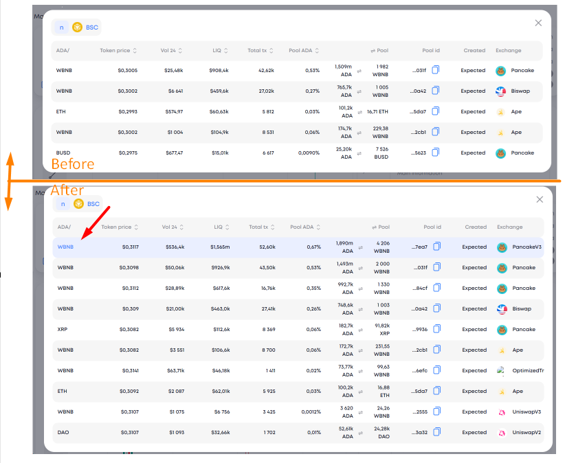 For at brugeren kan forstå, hvilket par der blev repræsenteret på diagrammet, når man åbner valgtabellen for tilgængelige par, er det aktive par fremhævet med en ekstra baggrund. På det første og andet billede viste diagrammet paret placeret i den første linje (diagrammet af paret, som åbnes som standard, når tokensiden indlæses).