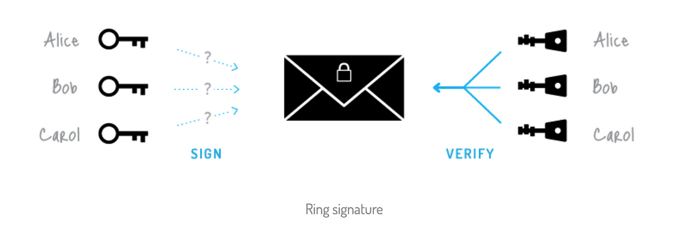 Ring signatures are a cryptographic signature technology that allows anyone who has a key to sign. One of the main features of the ring signature is the fact that it is impossible to determine which user in the group has signed. Ring signature technology is widely used in anonymous cryptocurrencies.