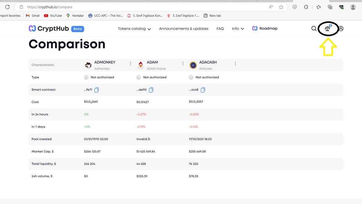 Na stranici za usporedbu tokena možete usporediti do 10 tokena. To će vam omogućiti da na praktičan način provjerite cijenu tokena od interesa za određeno razdoblje, likvidnost, tržišnu kapitalizaciju i druge važne parametre. Na stranicu za usporedbu tokena možete doći klikom na ikonu "težine" u zaglavlju web stranice ili slijedeći link https://crypthub.io/compare.