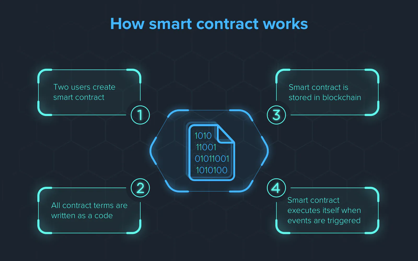 สัญญาอัจฉริยะเป็นสัญญาอัตโนมัติที่พื้นฐานอยู่บนอัลกอริทึมที่สร้างขึ้นโดยใช้รหัสคอมพิวเตอร์ที่ให้การโอนสารสนเทศ นี้จำเป็นสำหรับการทำสัญญาในสภาพแวดล้อมบล็อกเชน รวมถึงการปฏิบัติตามข้อกำหนดของสัญญาเหล่านี้โดยทั้งสองฝ่าย สัญญาอัจฉริยะถูกแสดงเป็นรหัสในบล็อกเชนซึ่งจัดการโดยเครือข่ายคอมพิวเตอร์ที่มีกำลังคำนวณมาก